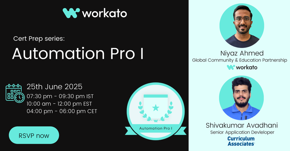 Join us for a FREE Certification Prep Webinar and take the first step toward becoming a Workato Automation Pro 1 certified!