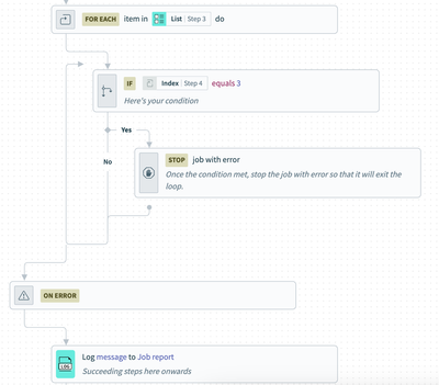 It depends on your use case; for example, if you want to stop the loop after several lists or indexes, you can add a condition and a monitor action to move to the next step in the recipe. Here's an example: