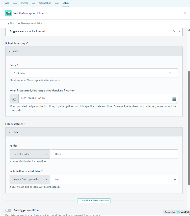 I have created the trigger several times to ensure I was doing it right. The trigger configuration is below. I have it set to every 5 minutes and have tried both a date in the "files from" as well as leaving it blank. I am finding it strange because the configuration seems very straightforward.