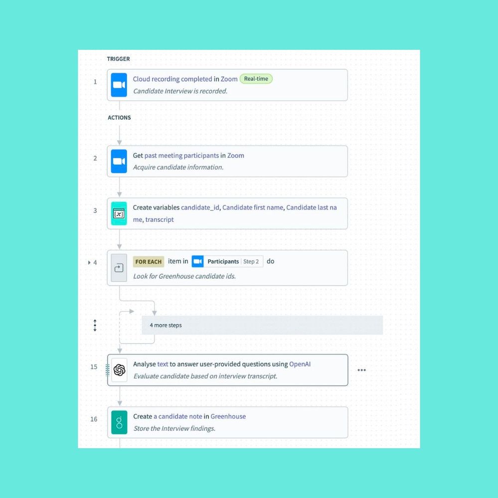 1️⃣ Once a candidate interview is complete in Zoom, the cloud recording is automatically processed through OpenAI