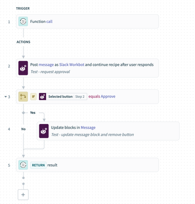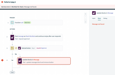 Hi, I am having a difficult time figuring this one out. I'm trying to post a message using Workbot for Slack with a custom OAuth profile. Posting the message to a user DM or channel works fine. I then want to continue the recipe when the button is clicked, but I keep getting an error: Message not found. I am using thing Message JSON datapill from the post message step. The custom app in Slack has all the necessary scopes, at least all the ones that are documented. I've tried updating the block by ID as well as posting a new message and updating an existing message using the message ID from the first step.